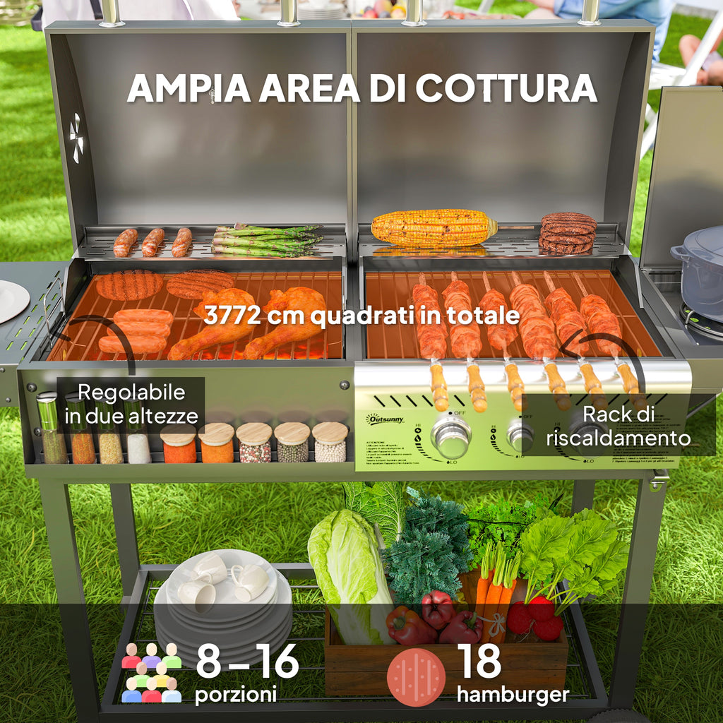 - AMPIA SUPERFICIE DI COTTURA: Offrendo una superficie di 3772 cm², questo barbecue a carbone e gas può accogliere da 8 a 16 persone. Le griglie e l'area carbonella sono regolabili su due livelli di altezza, mentre i ripiani termici inclusi conservano il cibo caldo e saporito