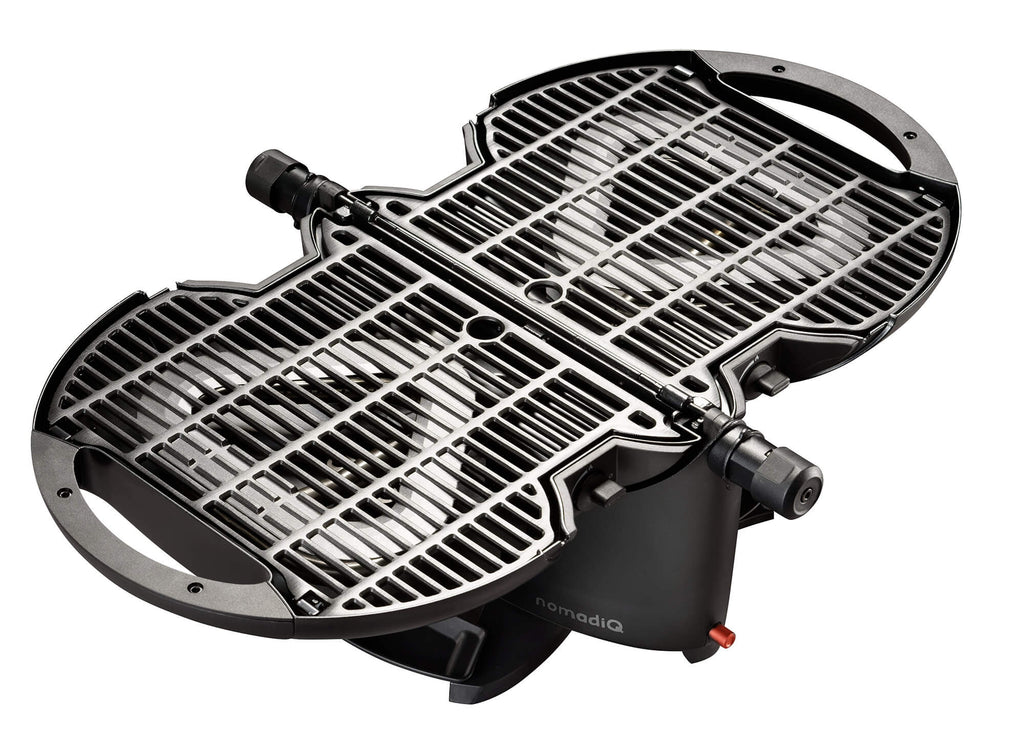 - Temperaturregelung: Die Flammen der beiden Sektionen können dank der an den Seiten angebrachten unabhängigen Bedienknöpfe individuell eingestellt werden. NomadiQ ist ideal zum gleichzeitigen Garen von Speisen, die unterschiedliche Zeiten und Temperaturen erfordern, wie beispielsweise auf dem Herd zu Hause.