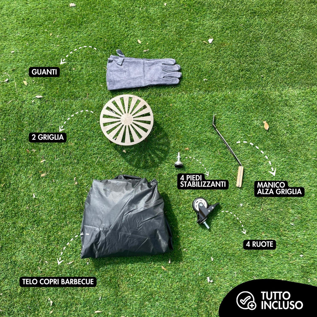 - ROBUSTO E RESISTENTE: Presenta una struttura robusta, peso 140Kg. Dotato di una doppia sezione di contenimento del calore, che impedisce alla fiamma di entrare in contatto con la struttura esterna del braciere, assicurandone la durevolezza nel tempo.