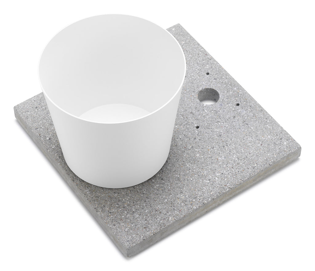 Base in graniglia di cemento completa di vaschetta verniciata con piletta di scarico. Per fontane con ghiera grande (tutte tranne 42/PS, 42/SR e 42/PSI). Completa di viti e tasselli.