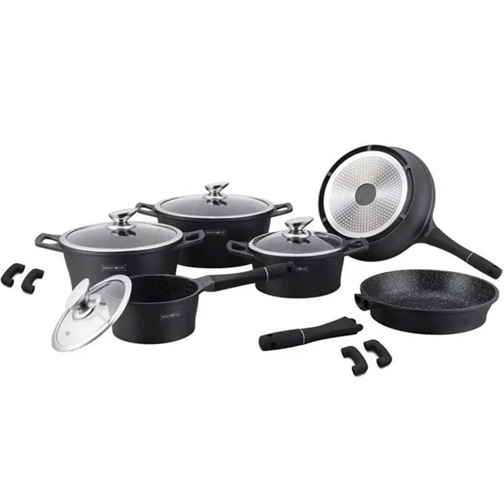- 1x Batterie Pentole e Padelle da Cucina 14 Pezzi Antiaderente In Pietra Lavica Coperchio in Vetro Clip Maniglie Rimovibili Colore Nero