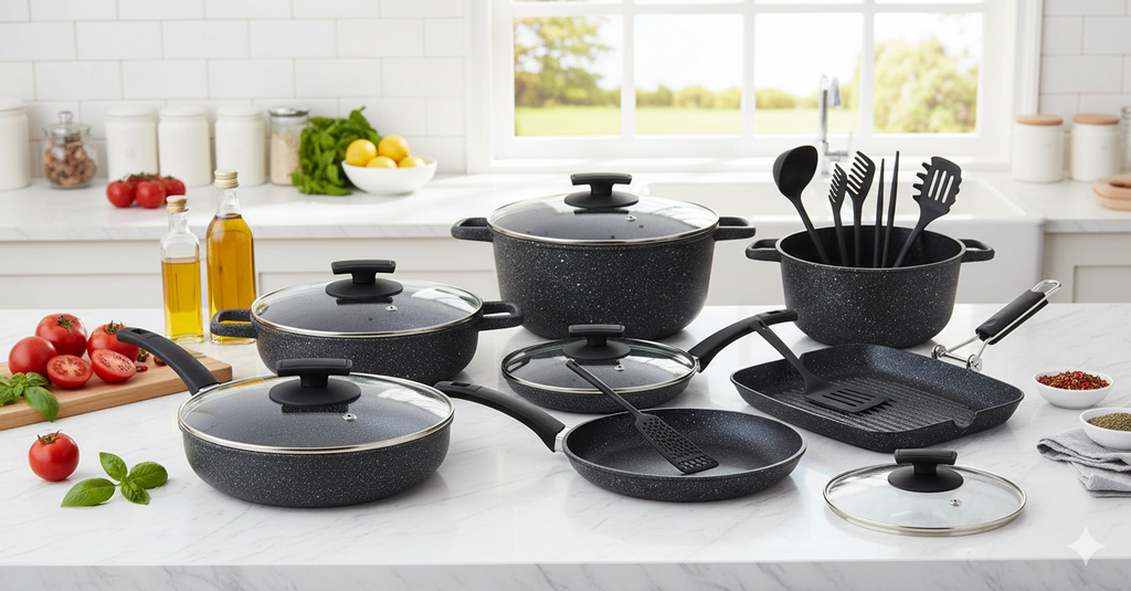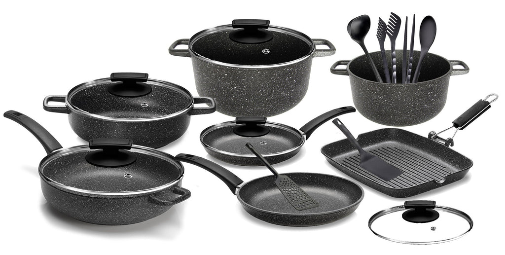 Olympia Hard Cook Kochgeschirr-Set 18-teilig aus Druckguss-Aluminium Antihaft-Stein-Effekt