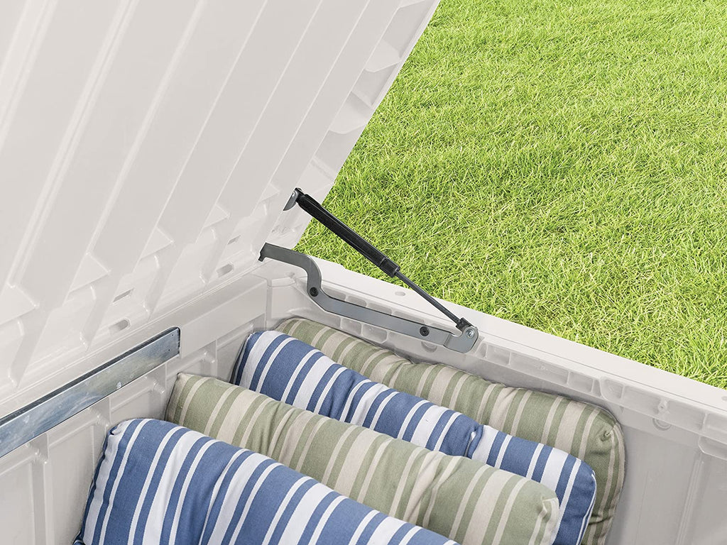 Halten Sie Ihren Poolbereich mit dieser stilvollen Aufbewahrungsbox in Holzoptik aufgeräumt. Mit seinem Fassungsvermögen von 454 Litern ist es ideal für die Aufbewahrung von Pool- und Whirlpool-Artikeln und hält sie trocken und belüftet. Es enthält auch ein Netz auf dem Deckel, um Ihre am häufigsten verwendeten Gegenstände aufzubewahren. Der Deckel bietet bequemen Sitzplatz für zwei Erwachsene.