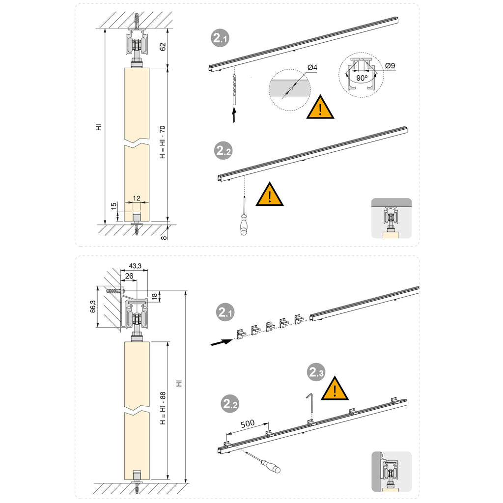 Die obere Schiene, durch die die Laufwagen gleiten, und die vordere Abdeckung zum Verbergen des Systems sind aus eloxiertem Aluminium und werden innerhalb von 2 Metern geliefert.