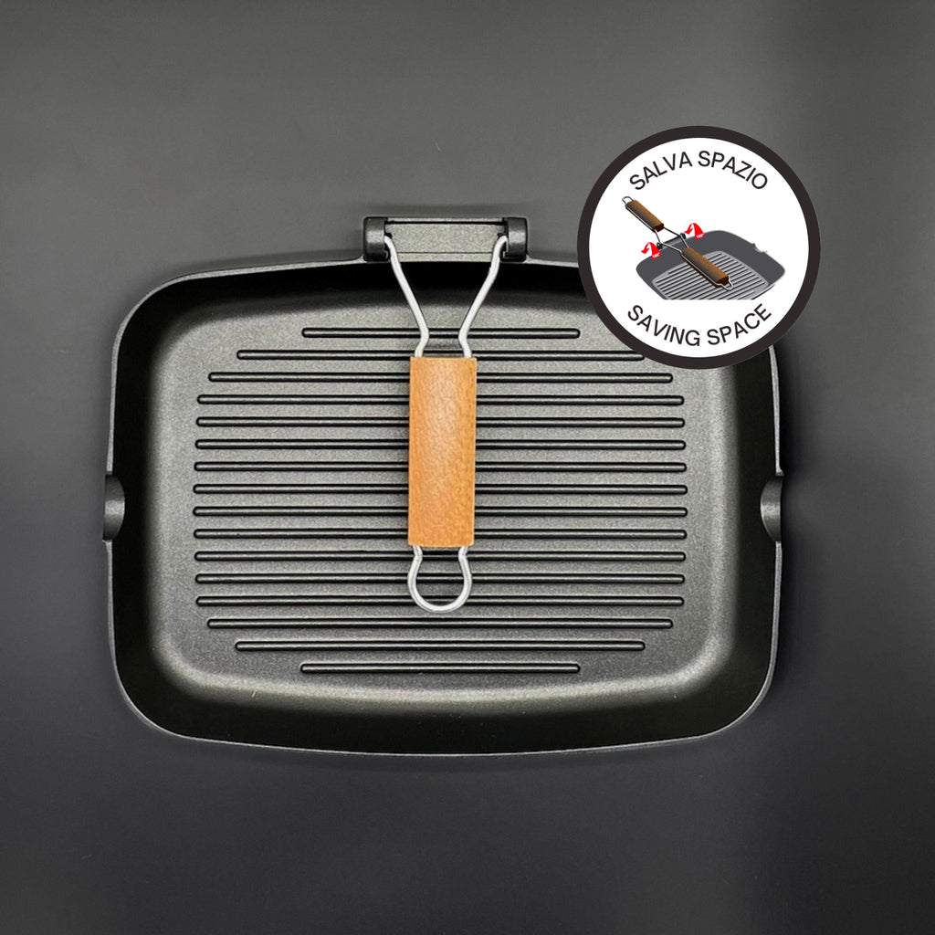 Bistecchiera, in alluminio pressofuso con rivestimento antiaderente. Grigliate perfette grazie all'alto spessore delle griglie e all'ottimo antiaderente. Comodo manico reclinabile salvaspazio.