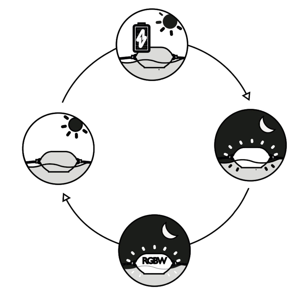 Boa galleggiante luminosa in PE Bianco opaco. La boa si ricarica autonomamente con la luce solare, senza l'uso del cavo di alimentazione.