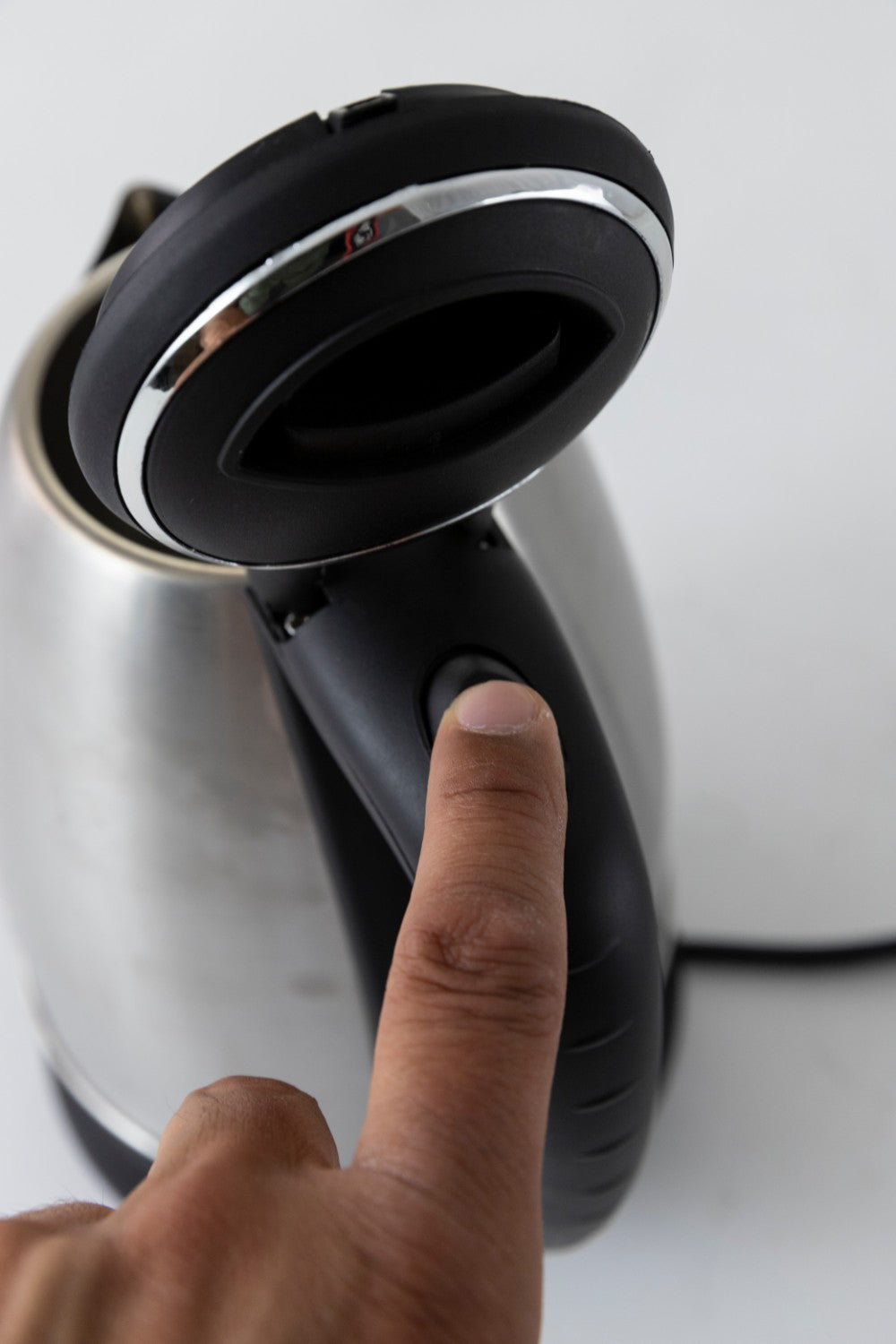 Um das Gerät zu bedienen, schließen Sie es einfach an und drücken Sie den Bedienknopf, wobei Sie darauf achten müssen, dass die Kanne richtig auf dem Sockel positioniert ist.