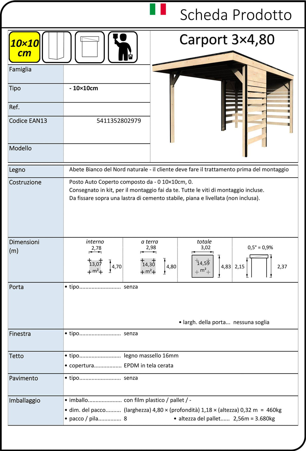 Box Posto Auto Coperto a Gazebo composto da pali 10×10 cm. Consegnato in kit per il montaggio fai da te con viti di montaggio incluse. Da fissare sopra una lastra di cemento stabile, piana e livellata (Lastra non inclusa).