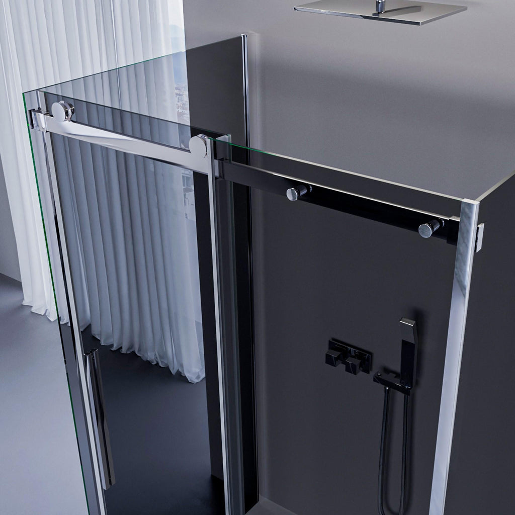 Dreiseitige Duschkabine mit extrem zarten Linien, 8 mm Kristalle ohne Profile werden Sie fesseln. Sowohl innen als auch außen mit Antikalk behandelt, was eine schnelle und einfache Reinigung gewährleistet. Stiftgriff 50 cm aus Edelstahl. Dreiseitige Duschabtrennung ohne Profile und ohne sichtbare Schrauben dank des Ghost-Glasbefestigungssystems. Räder aus Edelstahl Aisi 304 mit Anti-Rollover-System in der Schiene. Glasverschluss mit Saugnapf und Türstopper.