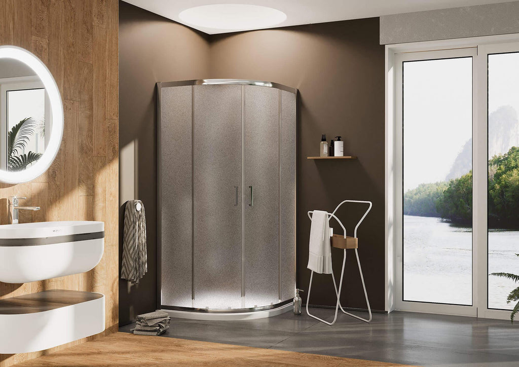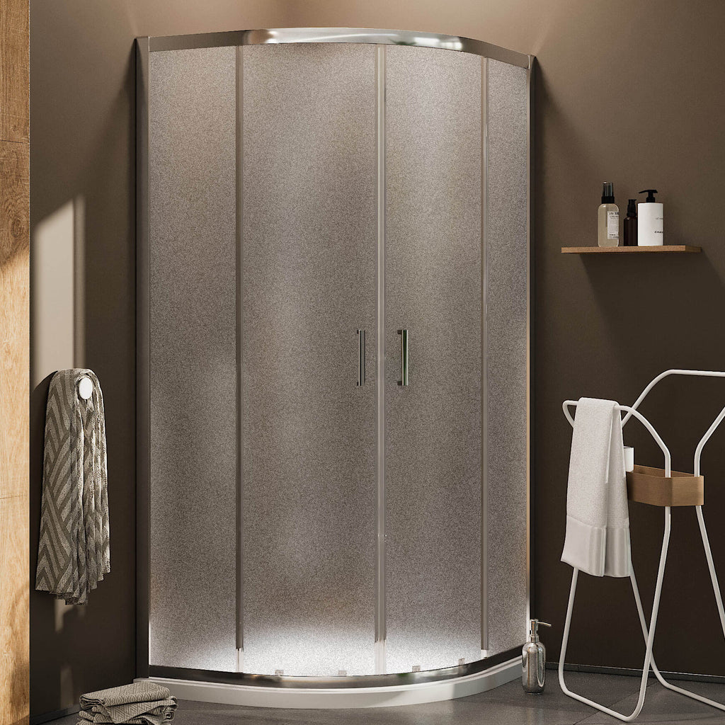 - Halbrunde Eckduschabtrennung bestehend aus 2 festen Türen und 2 Schiebetüren