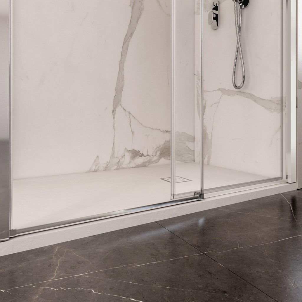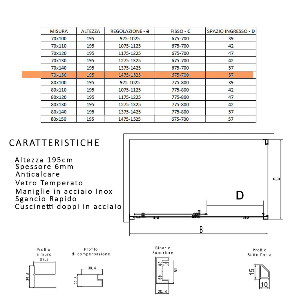 2-seitige Duschkabine mit verschiebbarem Vordereingang, ausgestattet mit Magnetverschluss für eine perfekte Wasserabdichtung, 6-mm-Kristall mit Anti-Kalk-Behandlung , die die Bildung von Kalk verhindert und die Reinigung erleichtert , indem Verunreinigungen nur mit heißem Wasser entfernt werden können. Es ermöglicht Ihnen , Geld zu sparen , indem Sie bestimmte Produkte nicht mehr kaufen müssen. Kann bodenbündig oder auf einer Duschwanne montiert werden . Räder aus Edelstahl und Teflon.