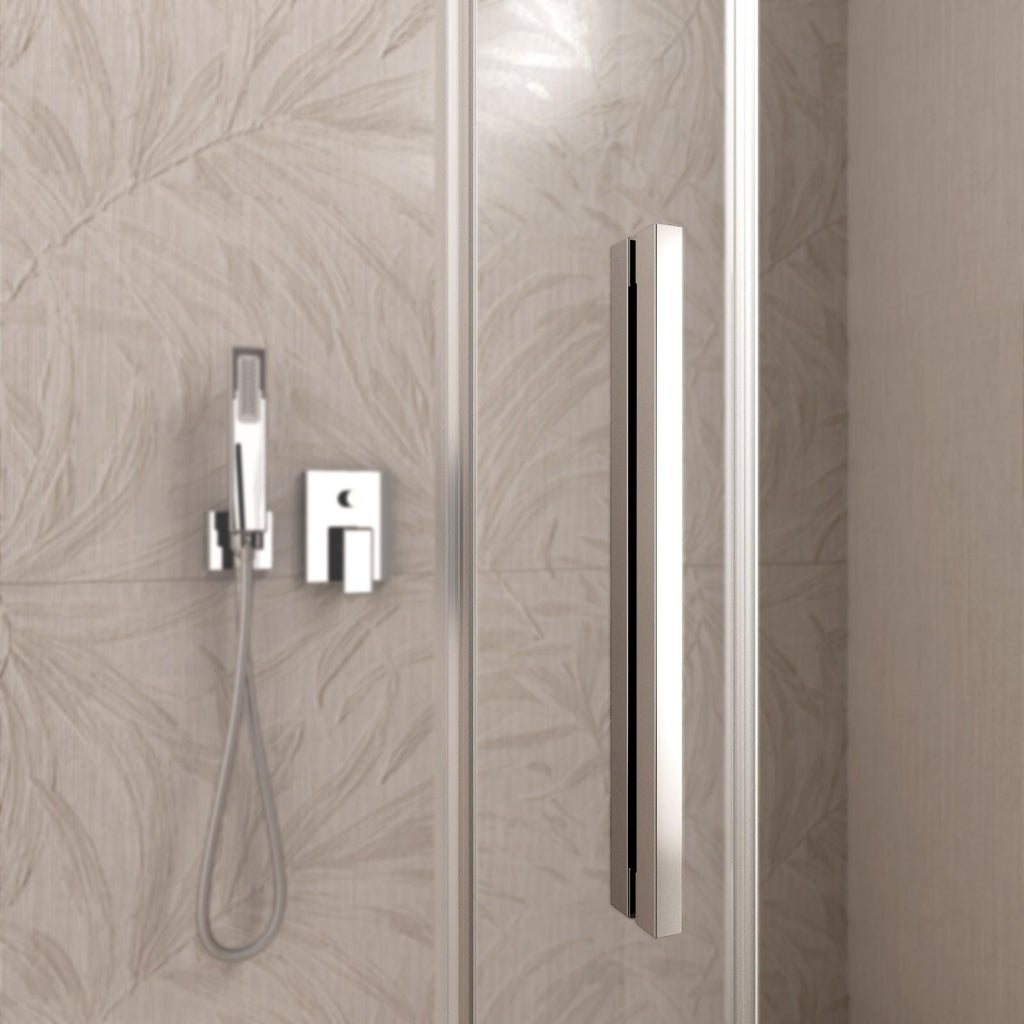 Diese zweiseitige Duschabtrennung verfügt über die Eigenschaften einer Duschabtrennung der Spitzenklasse und positioniert sich im Luxusproduktsegment. Duschabtrennung mit Komponenten, die für eine lange Lebensdauer ausgelegt sind. Halbglänzendes, eloxiertes, verchromtes Aluminium. Griffe aus Edelstahl Aisi 304. Anti-Kalk-Behandlung im Ofen Nano K1. ISO-zertifizierte gehärtete Kristalle gemäß CE-Normen.