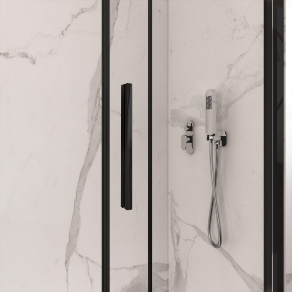 2-seitige Duschkabine mit schwarzen Profilen , Schiebetür mit Magnetverschluss für perfekte Wasserdichtigkeit, 6-mm-Kristall mit Antikalkbehandlung , die die Bildung von Kalk verhindert und die Reinigung erleichtert , indem Verunreinigungen nur mit heißem Wasser entfernt werden können. Es ermöglicht Ihnen , Geld zu sparen , indem Sie bestimmte Produkte nicht mehr kaufen müssen. Kann bodenbündig oder auf einer Duschwanne montiert werden . Räder aus Edelstahl und Teflon