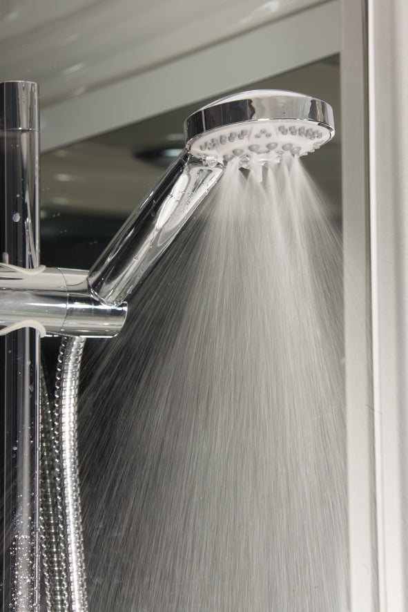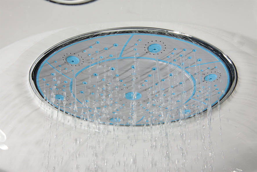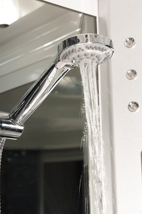 Tragprofile aus Aluminium, LED-Innenbeleuchtung, Dampfabzug, Radio, Telefonhörer, zentraler Brausekopf, Gleitstange, 6 Hydromassagedüsen für Schultern und Rücken, Strahlverstellung, Touchscreen-Display zur Einstellung aller Ihrer bevorzugten Duschfunktionen, Flaschenhalter für Sprudelbad und Fußmassage.