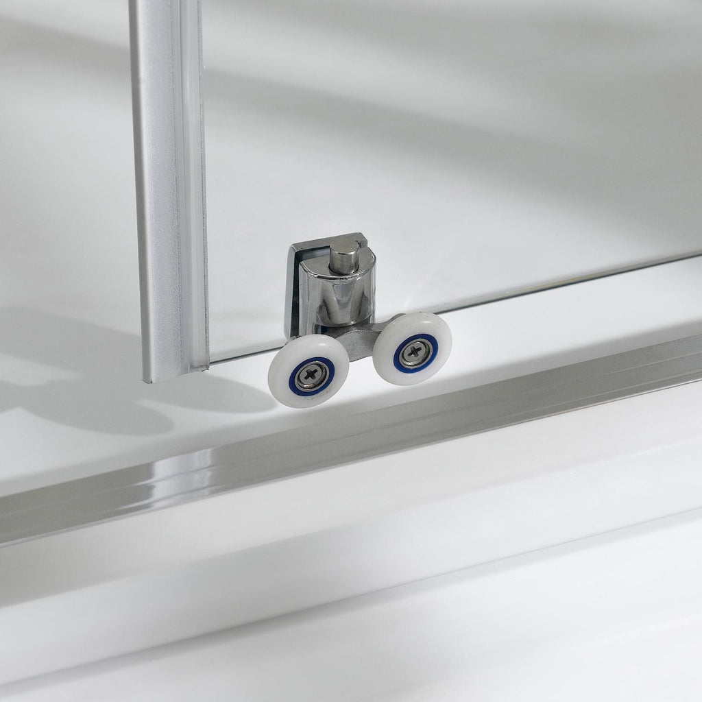- Schiebesystem der Schiebetüren im verchromten Korpus auf 16 Nylonrädern mit Kugellagern