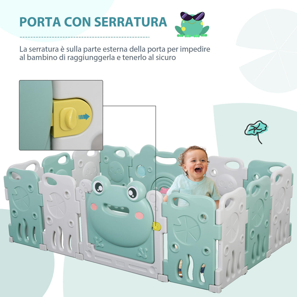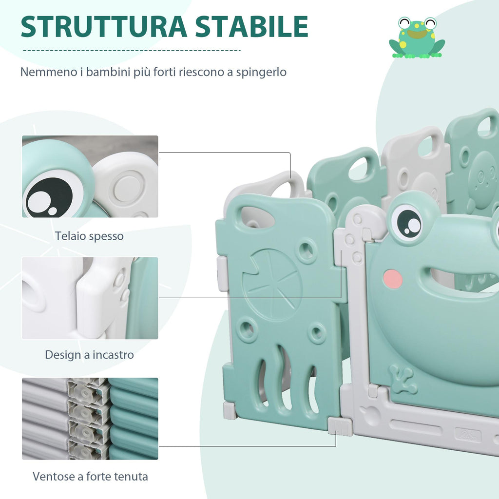 - LUSTIGE SPIELE: Eine Wand ist mit Geräuschspielen, einem rotierenden Ball und einer rotierenden Scheibe ausgestattet, um die Geschicklichkeit der Kleinen zu fördern. Das Froschmuster macht diesen Laufstall für Kinder zum Vergnügen
