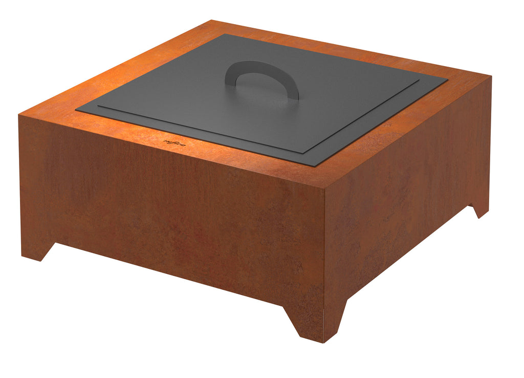 Un Braciere quadrato composto da un involucro in acciaio con rivestimento Corten dal colore rossastro e un solido inserto in acciaio nero. L'acciaio corten, abbreviazione dei termini inglesi che definiscono le caratteristiche principali, CORrosion restistance (resistenza alla corrosione) e TENsile strength (resistenza a trazione), è un materiale a basso contenuto di lega.
