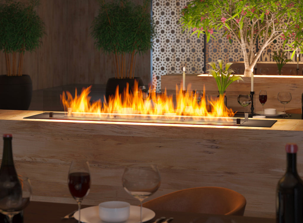 Bruciatore a Bioetanolo dotato di un sistema di ventilazione che impedisce l'accumulo di pressione sotto il bruciatore in caso di trabocco del combustibile. Un ulteriore serbatoio sotto il bruciatore garantisce maggiore sicurezza in caso di fuoriuscita di combustibile dal biocamino.