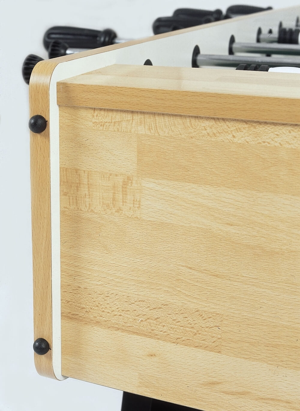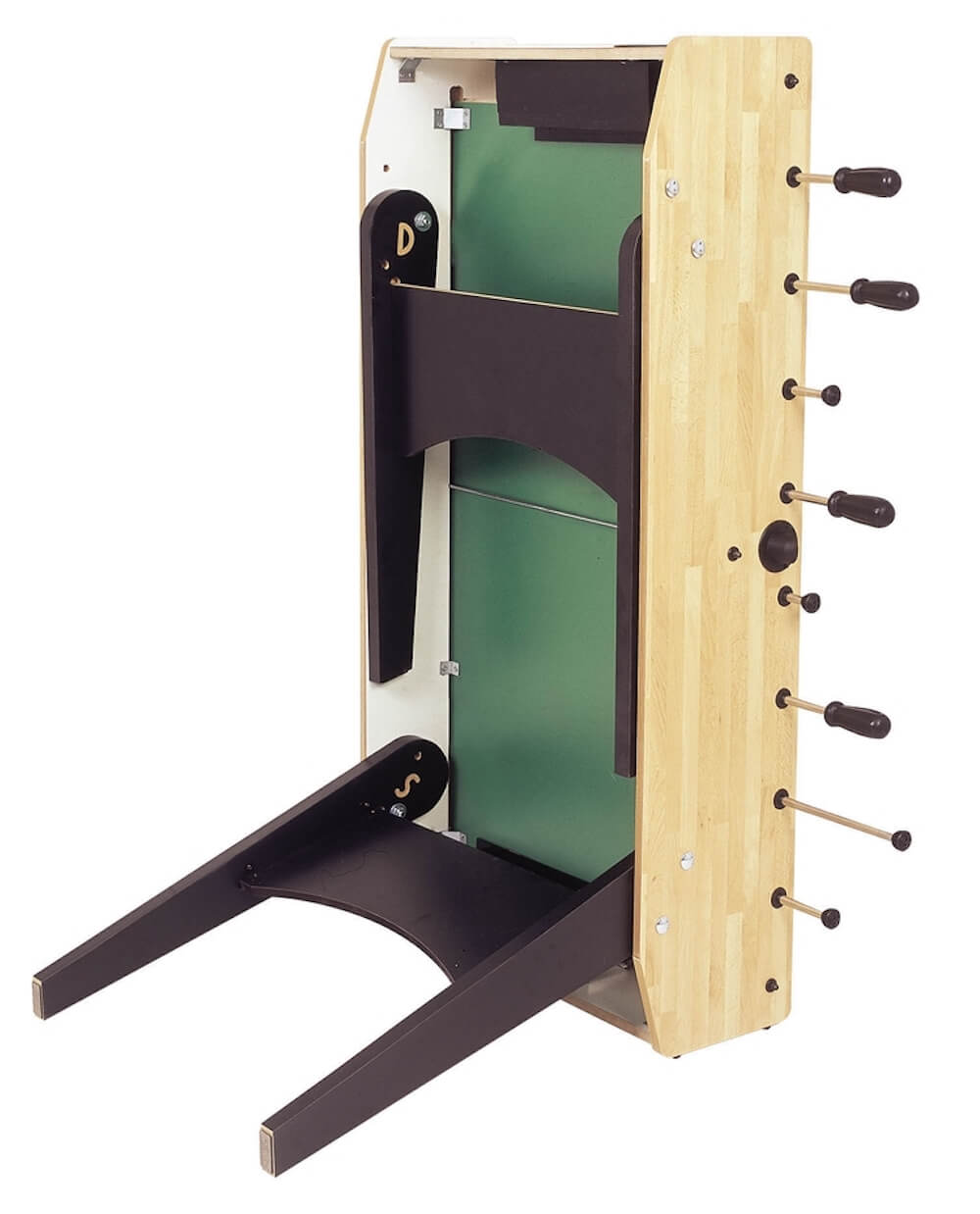 Spezielle Gummiauflagen ermöglichen eine einfachere Abstützung der Box auf dem Boden, wenn sich der Kickertisch in vertikaler Position befindet.