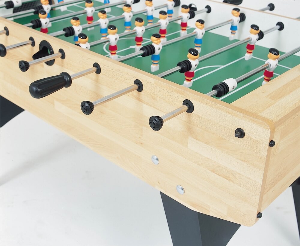 Der Tischkicker F-10 wurde für den Spaß der ganzen Familie entwickelt, ist aber besonders für Erwachsene geeignet, da er nicht mit teleskopierbaren Sicherheitsstangen erhältlich ist. Er bietet Stabilität, Robustheit und eine hohe Verarbeitungsqualität.