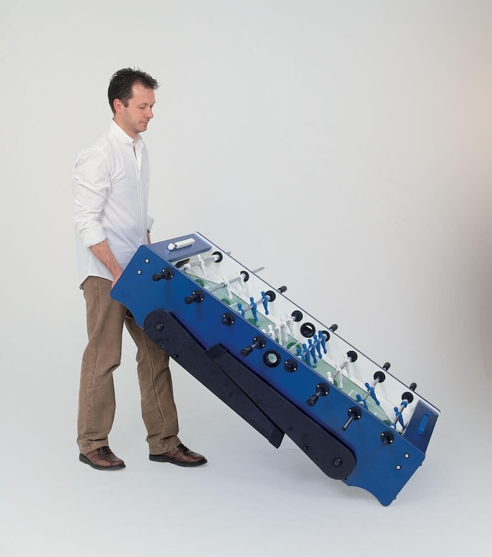 Ideal für alle Umgebungen, in denen es keine Möglichkeit gibt, dem Tischfußball einen besonderen Platz zu widmen, kann er bequem verstaut werden. Das Möbelstück ist in der Tat mit zwei Rädern ausgestattet, die es ermöglichen, es leicht zu bewegen, sobald die Beine eingeklappt sind.