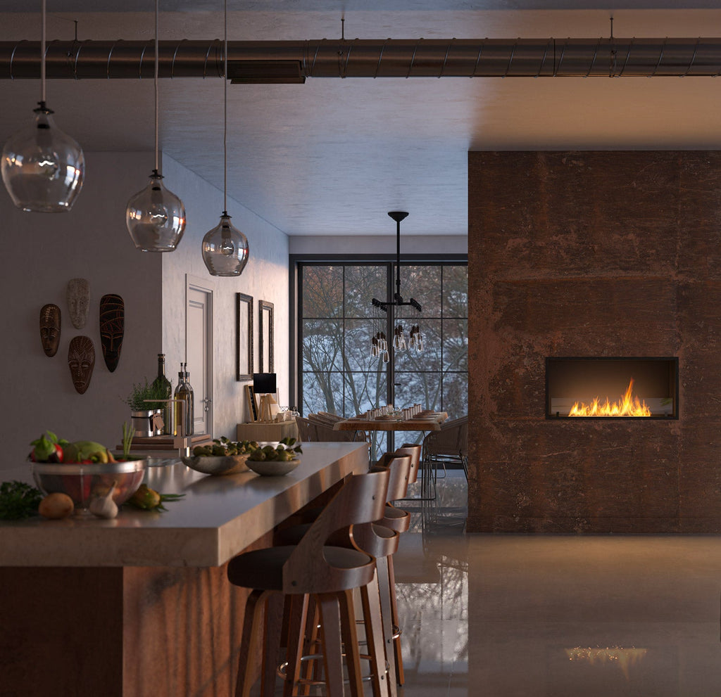 Biocamini dalla forma snella e minimalista, dove l'idea principale è un colore uniforme tutto in nero, con una finitura del telaio in una caratteristica forma minimalista sotto forma di una cornice stretta.