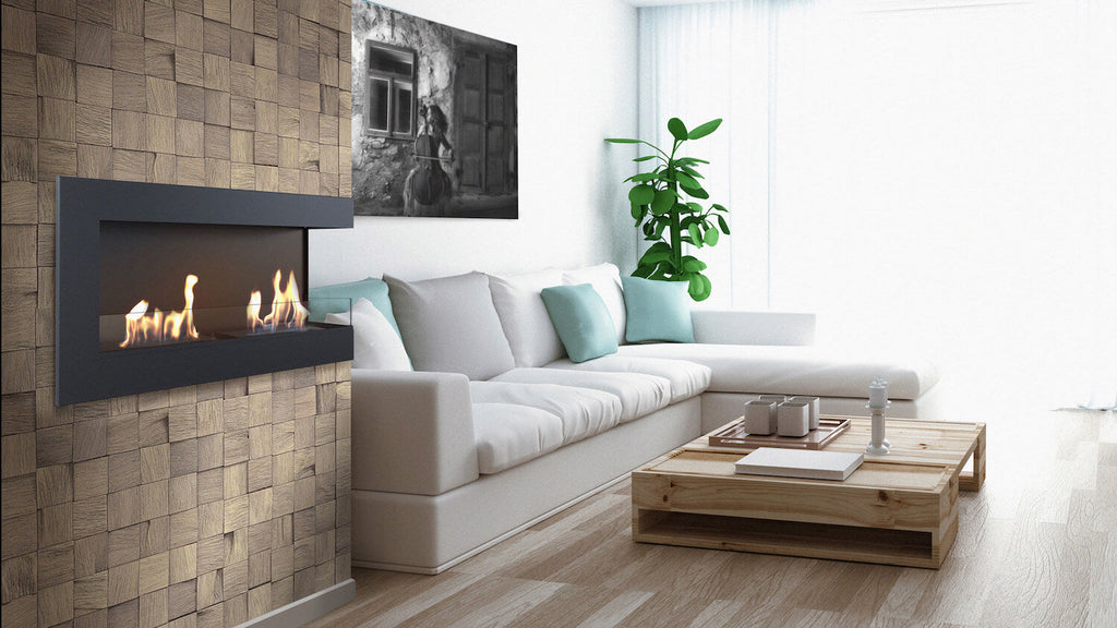 Ein horizontaler Bio-Eckkamin, der auf der rechten Seite offen ist, ist die ideale Lösung für den Einbau in einer Ecke des Hauses.