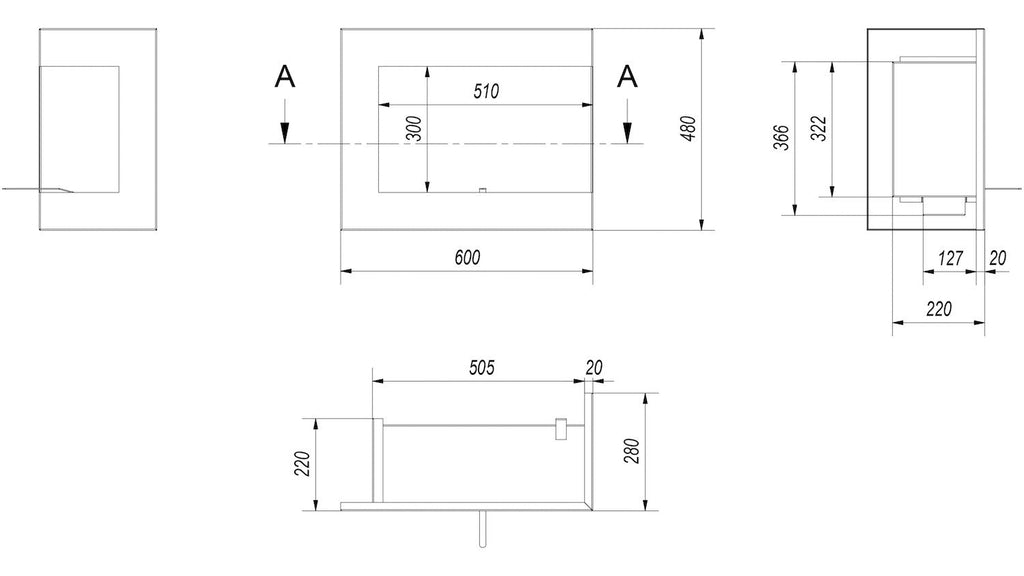 Technische Merkmale Bioethanol-Einbaukamin 60x48x28cm Flig Tampa Schwarz mit und ohne rechtem Eckglas
