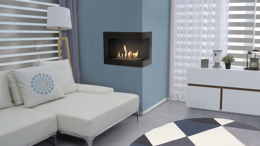 Ein horizontaler Bio-Eckkamin, der auf der rechten Seite offen ist, ist die ideale Lösung für den Einbau in einer Ecke des Hauses.