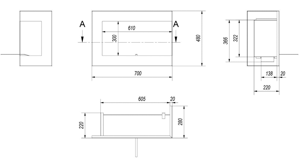 Technische Merkmale Bioethanol-Einbaukamin 70x48x28cm Flig Tampa Black mit und ohne rechtem Eckglas