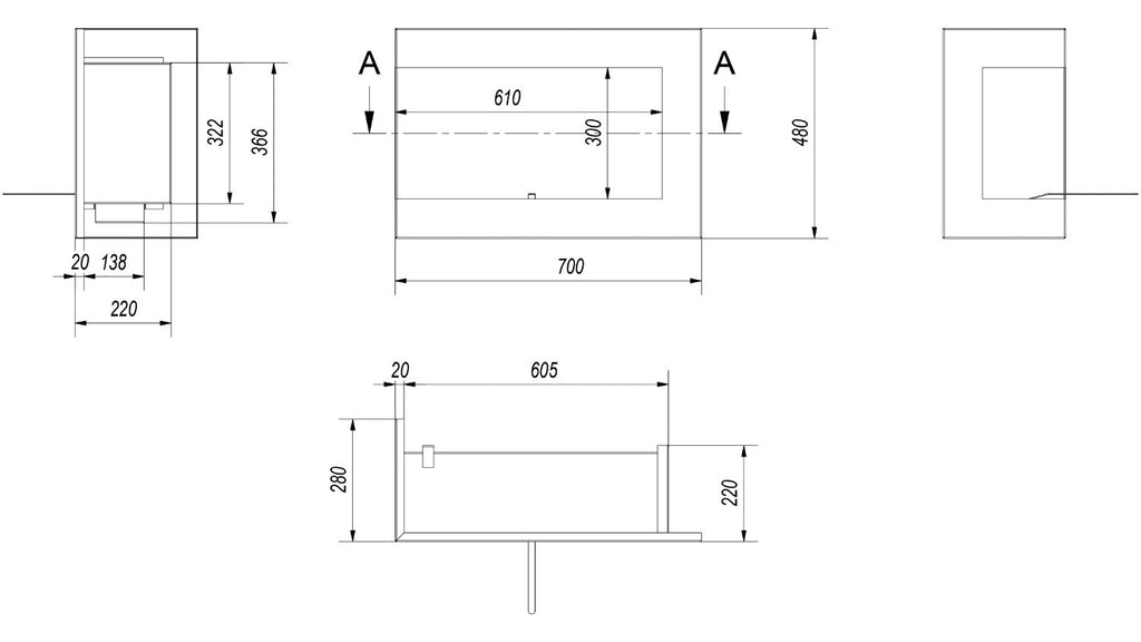Technische Merkmale Bioethanol-Einbaukamin 70x48x28cm Flig Tampa Schwarz mit und ohne linkes Eckglas