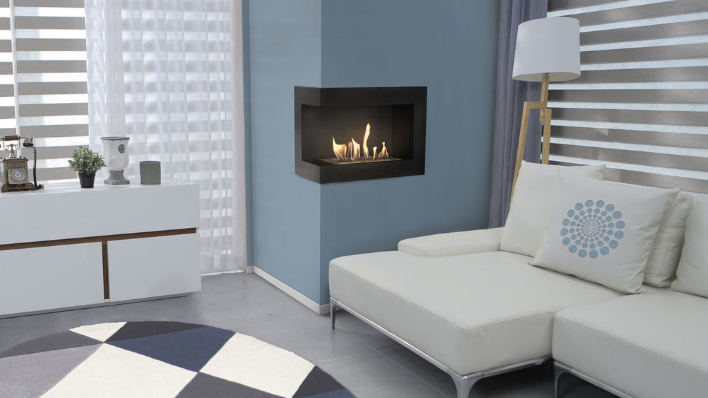Ein horizontaler Bio-Eckkamin, der auf der rechten Seite offen ist, ist die ideale Lösung für den Einbau in einer Ecke des Hauses.
