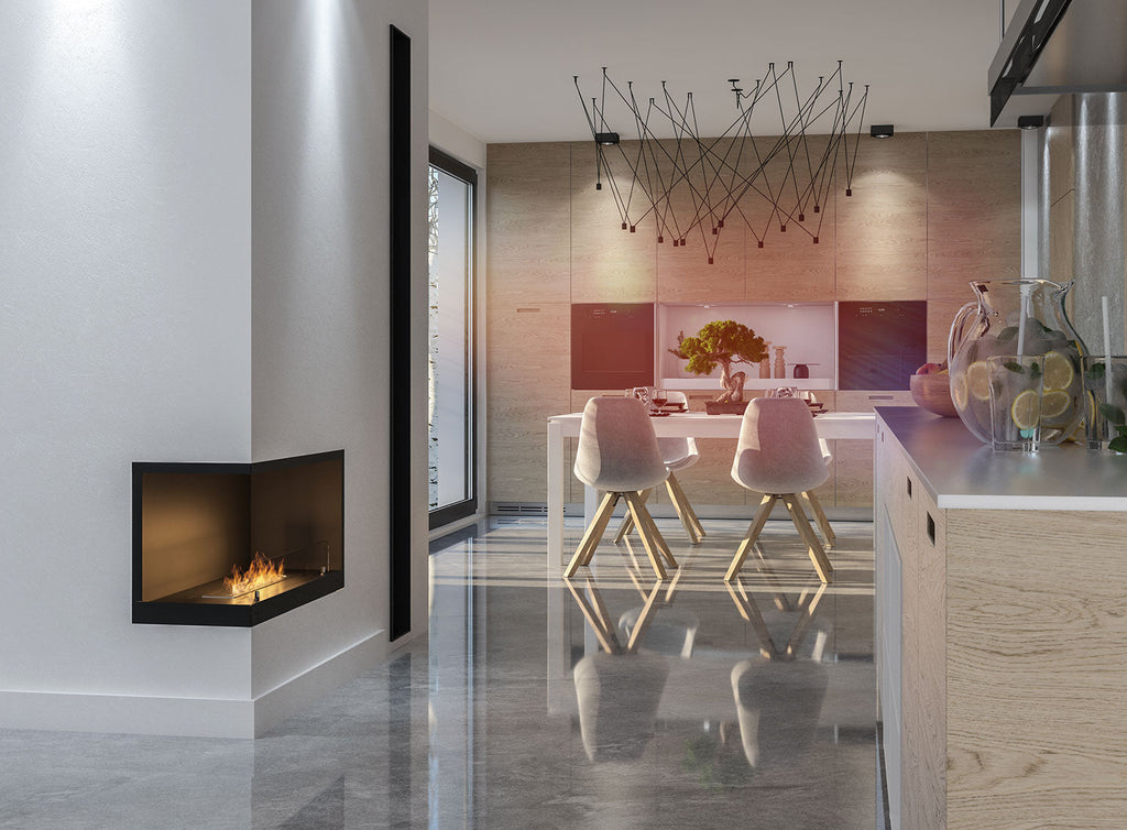 Ein horizontaler Bio-Eckkamin, der auf der rechten Seite offen ist, ist die ideale Lösung für den Einbau in einer Ecke des Hauses.