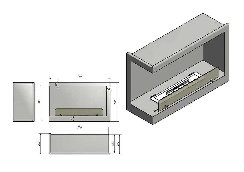 Bioethanol-Einbaukamin 84x54x29 cm Inside L800 V1 Linke Ecke Schwarz mit Glas