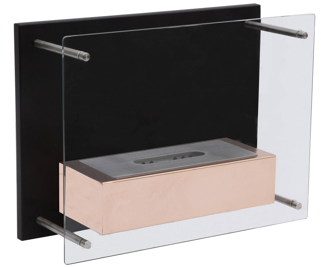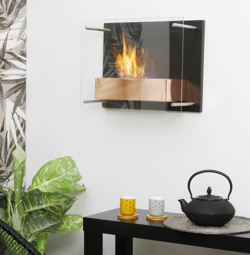 Ein Wandkamin, mit Schutzglas, das den Verbrennungsbereich abschließt. Elegant, aus Glas, Edelstahl und schwarz lackiertem Blech und roséfarbenem Brennerhalter aus verzinktem Eisen.