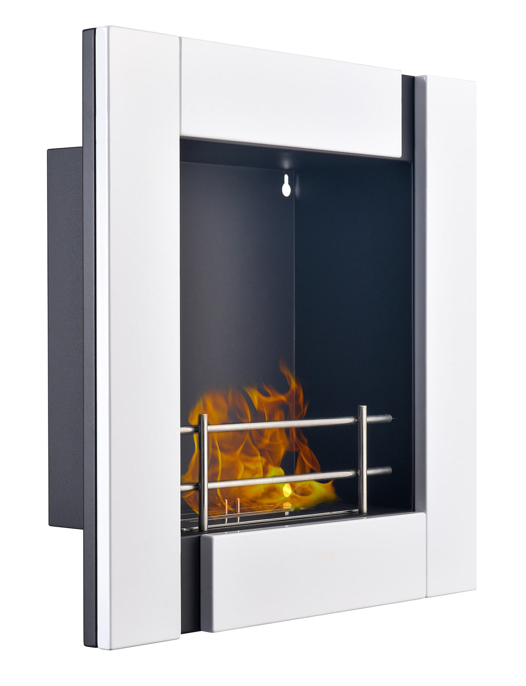 Camino a bioetanolo da parete o da incasso con bruciatore da 1,2 lt, certificato EN 16647, con lana di roccia. Inserto in acciaio verniciato nero. La scocca è in legno MDF dipinto bianco, resistente al calore. Dotato di doppia sbarra in metallo a protezione della fiamma. Kit di montaggio incluso.