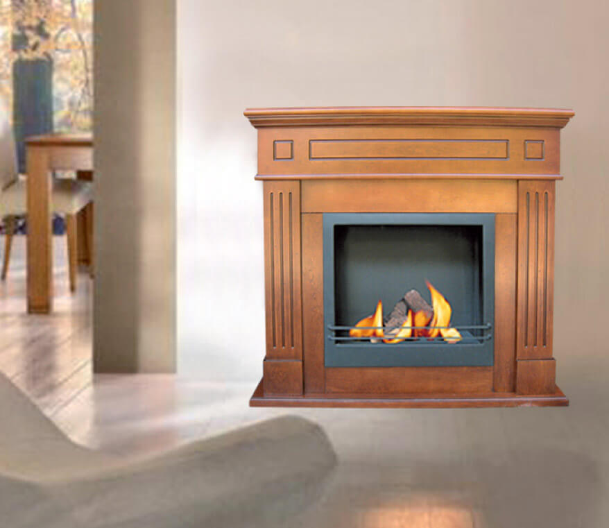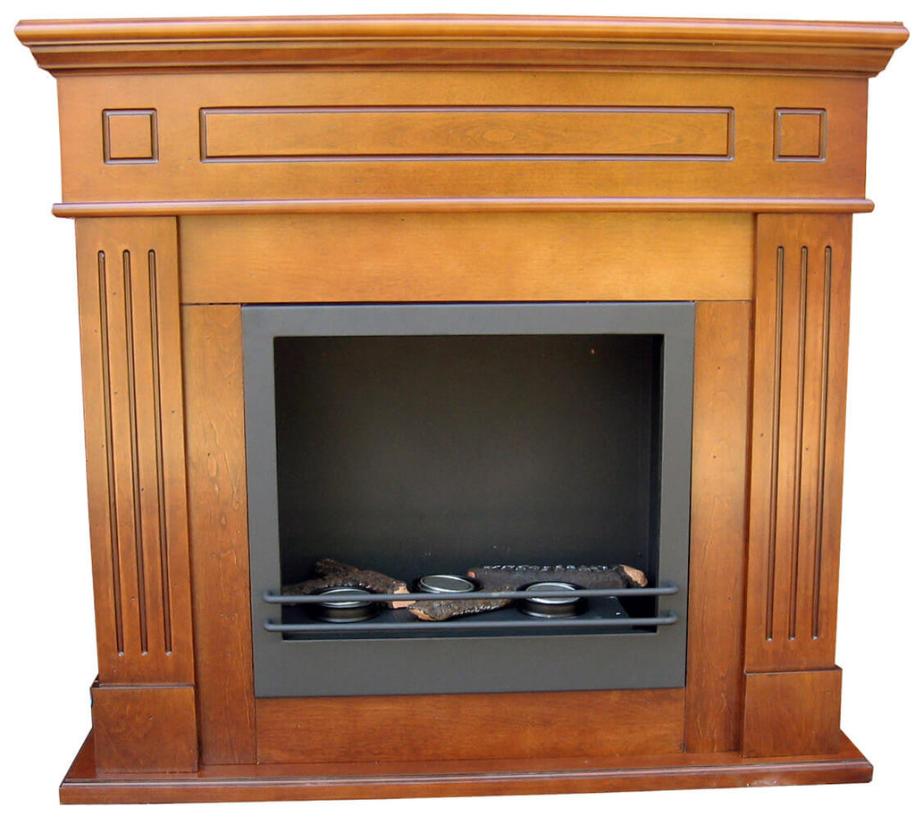 Ökologischer Kamin mit antikisiertem Walnussholzmantel. Er kommt ohne Schornstein aus und ist mit 3 Brennern à 340 ml ausgestattet, die eine maximale Leistung von 3,5 kw/h entwickeln. Ausgestattet mit 3 feuerfesten Keramikscheiten.