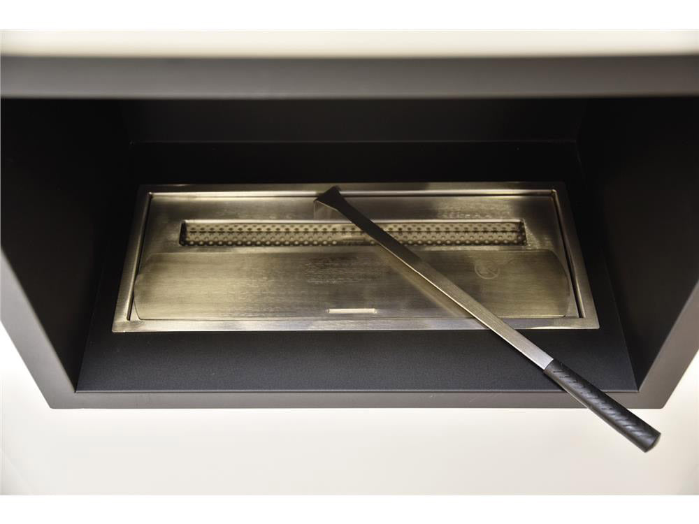 Die Öffnung des Tanks lässt sich dank des innovativen Designs mit abgerundeten Ecken, die ein reibungsloses Gleiten des Dämpfers von oben nach unten ermöglichen, leicht anpassen. Mit dem Biokamin gelieferter Metallarm zum Öffnen des Brenners.