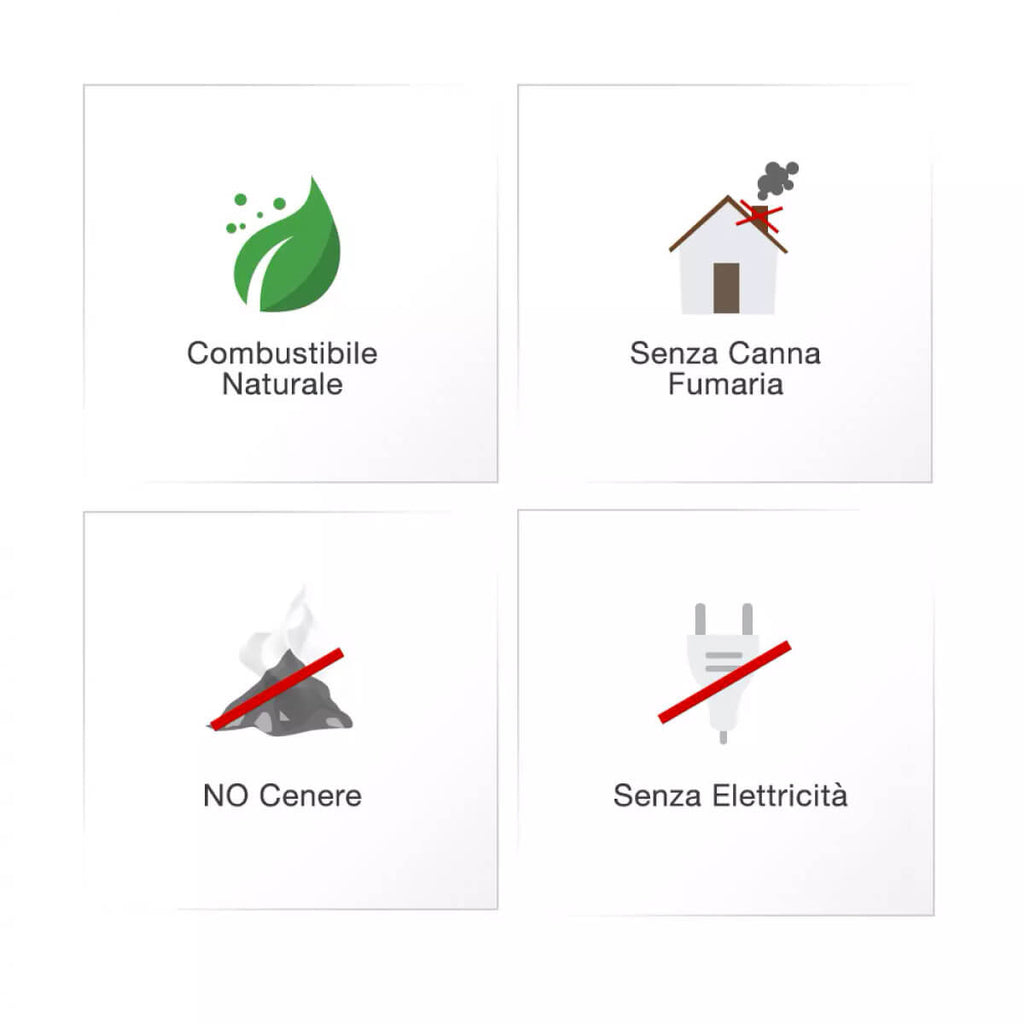 Der Bioethanol-Kamin erfordert im Allgemeinen keine Wartung nach der Montage, erzeugt keine Asche und keine Rückstände, außerdem wird das Vorhandensein von Elementen, die Verschleiß unterliegen können, vollständig vermieden, was eine dauerhafte Stabilität garantiert.