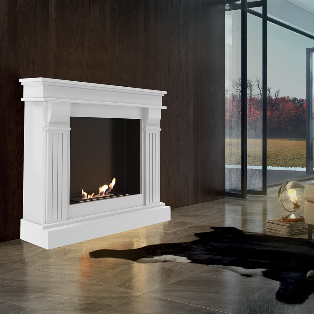 Bioethanol-Bodenkamin mit klassischem Design, das einem echten traditionellen Kamin nachempfunden ist. Dieser Biokamin ist einfach zu installieren und kann an jeder flachen Wand aufgestellt werden. Durch Zugabe einiger Tropfen parfümierter Essenz zum Bioethanol kann der Biokamin auch als Aromadiffusor verwendet werden.