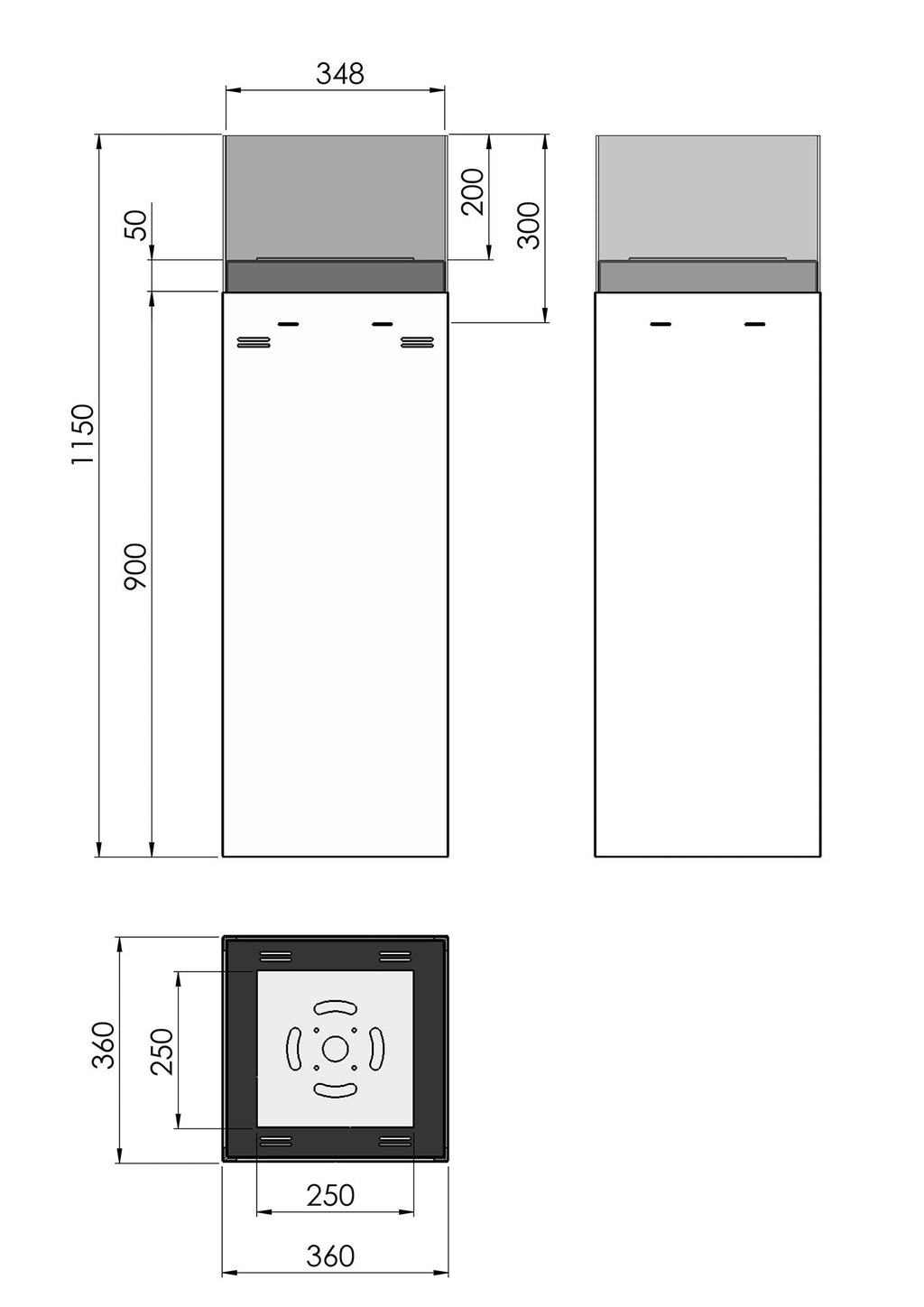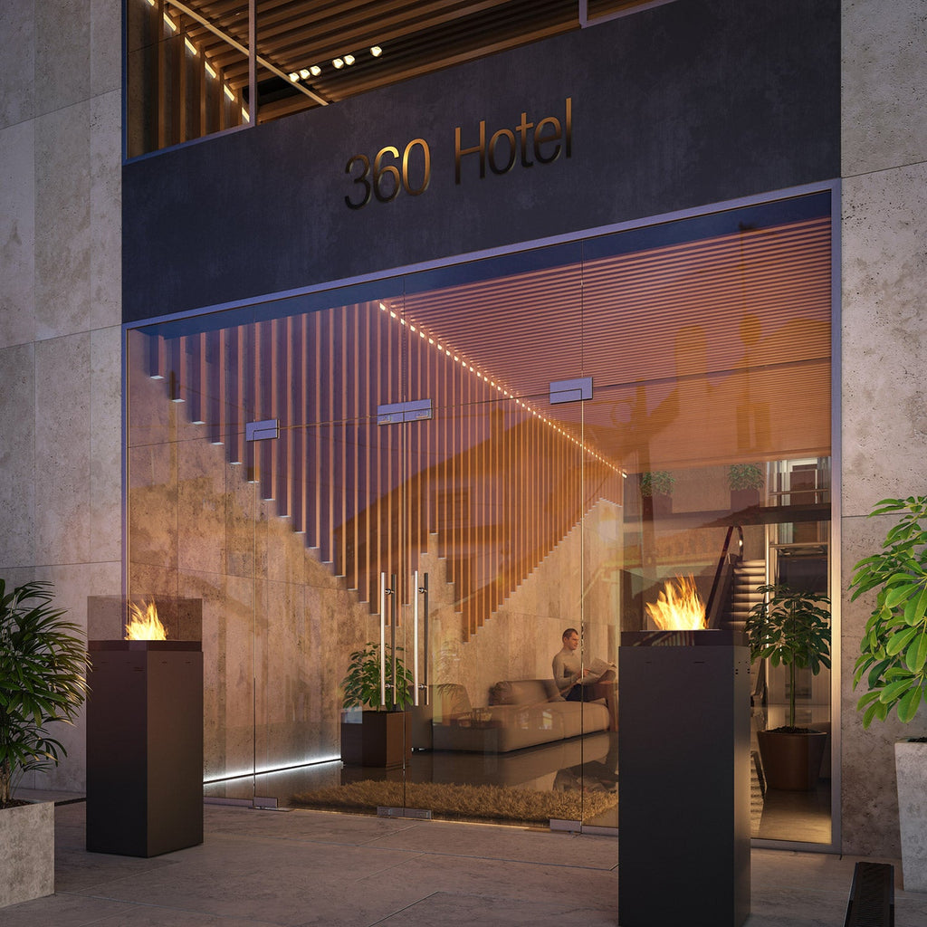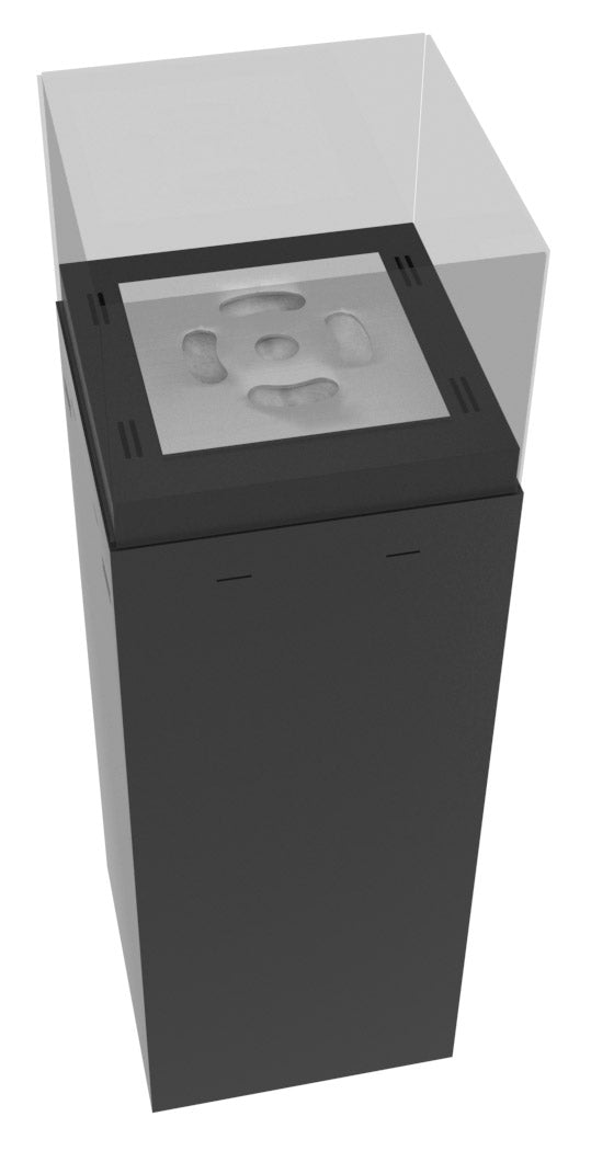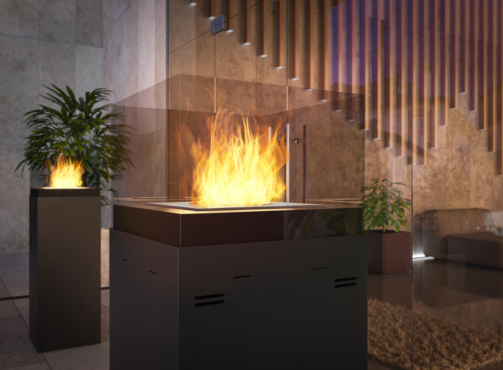 Instate 1150 ist die höchste Form des Kamins Instate 850 Der Biokamin hat die Form einer geometrischen Säule mit Feuerraum und Sicherheitsglas. Es wird nicht nur im Innenbereich, sondern auch im Außenbereich (z. B. auf Terrassen, Balkonen oder am Eingang von Gebäuden oder Gebäuden) perfekt sein.