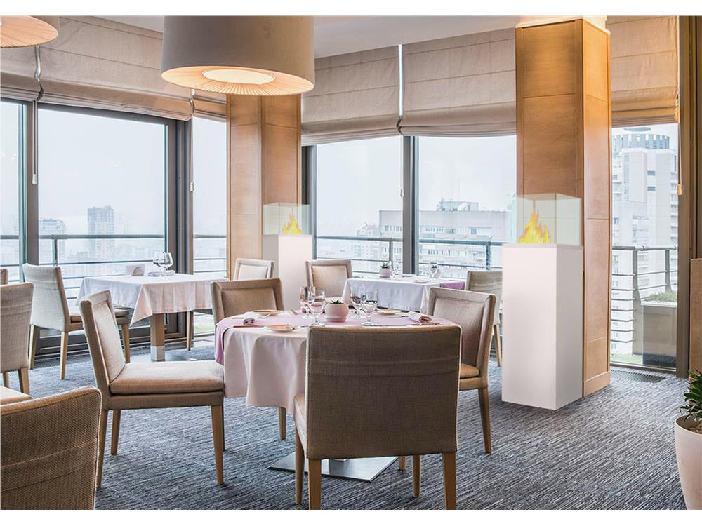 Säulen-Biokamin mit viereckigem Fuß aus weißem Metall und Glasplatte, um die Schönheit der brennenden Flamme zu enthüllen.