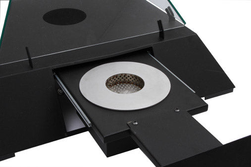 Camino a bioetanolo a forma di elegante piramide in acciaio nero, vetro temperato. Può essere collocata sul pavimento. Bruciatore rotondo da 2 lt posto in un cassetto facilmente apribile in sicurezza per il refill.
