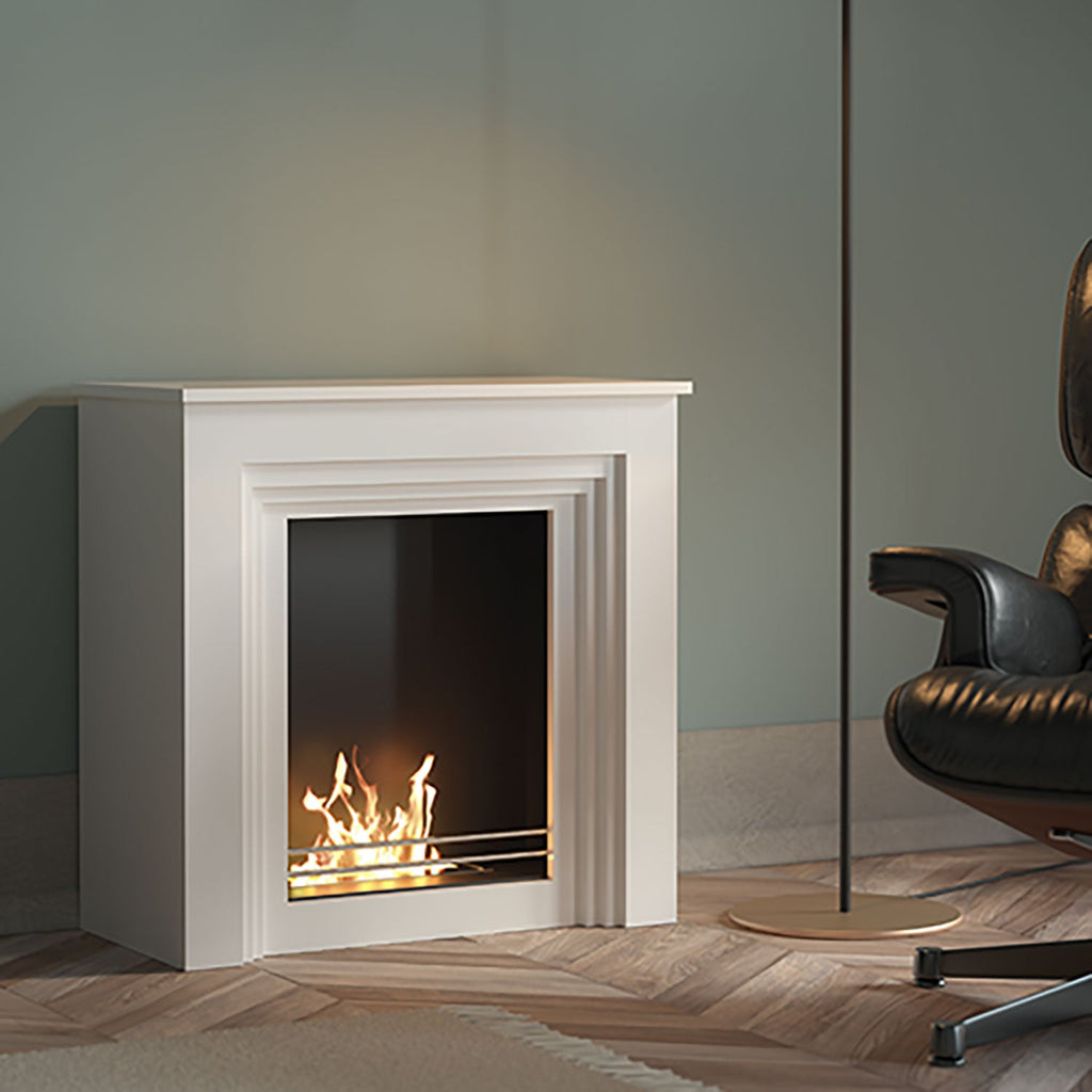 Camino a bioetanolo da pavimento, struttura in legno MDF e focolare in acciaio verniciato nero. Dotato di bruciatore regolabile e removibile con fibra e coperchio di chiusura fiamma. Installazione semplice che non richiede canna fumaria e allacciamento elettrico. Certificato secondo la normativa EN 16647:2016.