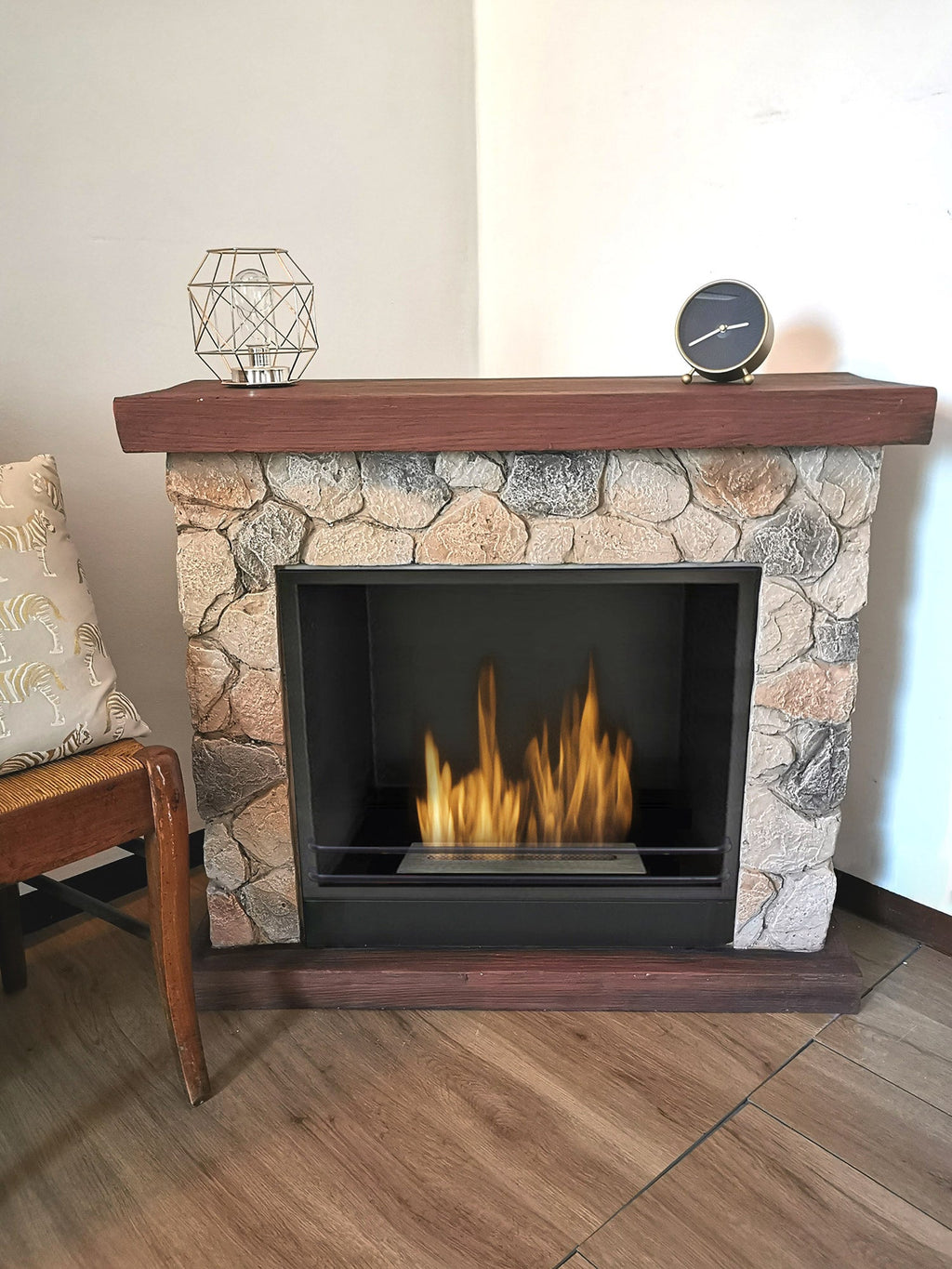 Sasso ist ein Bioethanol-Kamin mit Steinoptik und Holzoptik für Ober- und Unterteil.