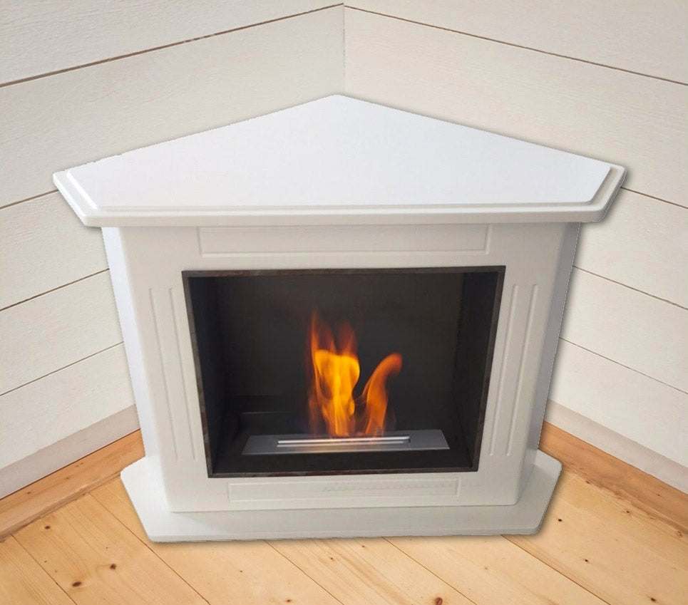 Eckiger ökologischer Bioethanol-Kamin mit Mantel aus bearbeitetem weißem Holz. Ausgestattet mit einem 1,7-Liter-Brenner mit doppeltem Boden und Steinwolle, zertifiziert nach UNI EN16647.
