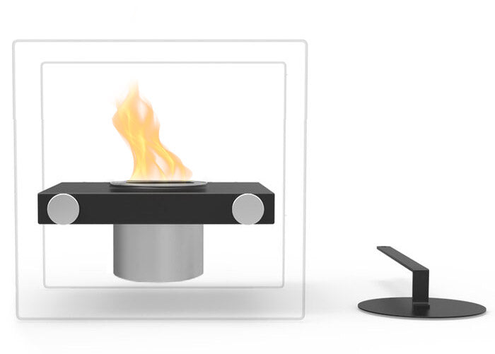 Camino a bioetanolo da tavolo, composto da due vetri resistenti al calore, un porta bruciatore in acciaio, un bruciatore tondo da 0,4 litri e uno spegnifiamma. Il bruciatore è certificato e dotato di lana di roccia e griglia protettiva; produce una fiamma di circa 15 cm.