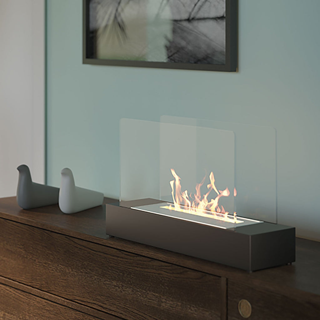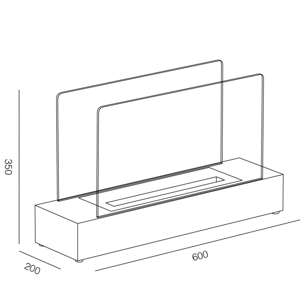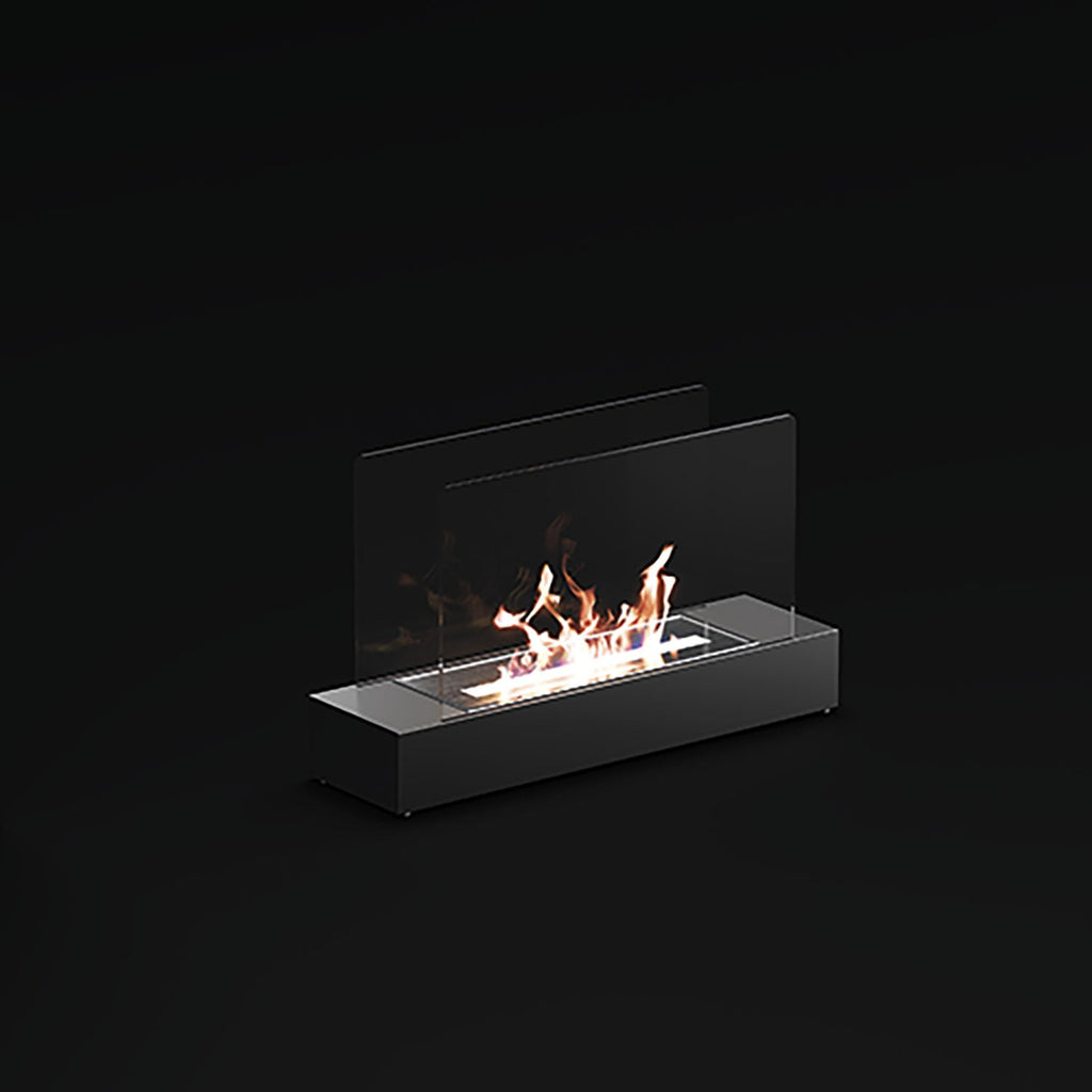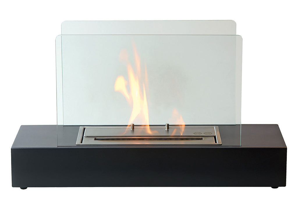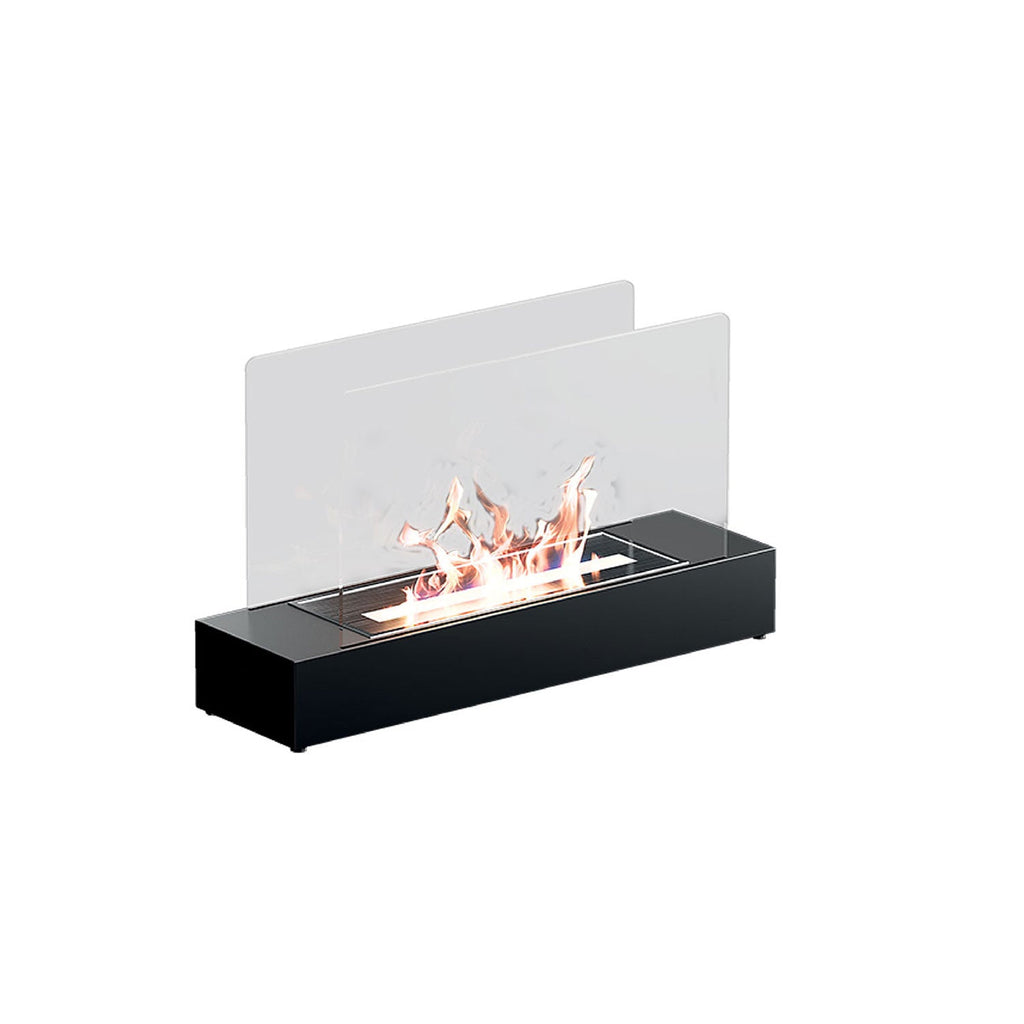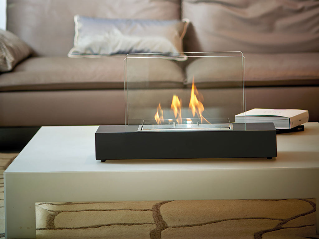 Camino a bioetanolo da tavolo, con 2 vetri temperati di protezione e struttura in acciaio verniciato. Dotato di bruciatore removibile con fibra e coperchio di chiusura fiamma. Installazione semplice che non richiede canna fumaria e allacciamento elettrico. Certificato secondo la normativa EN 16647:2016.