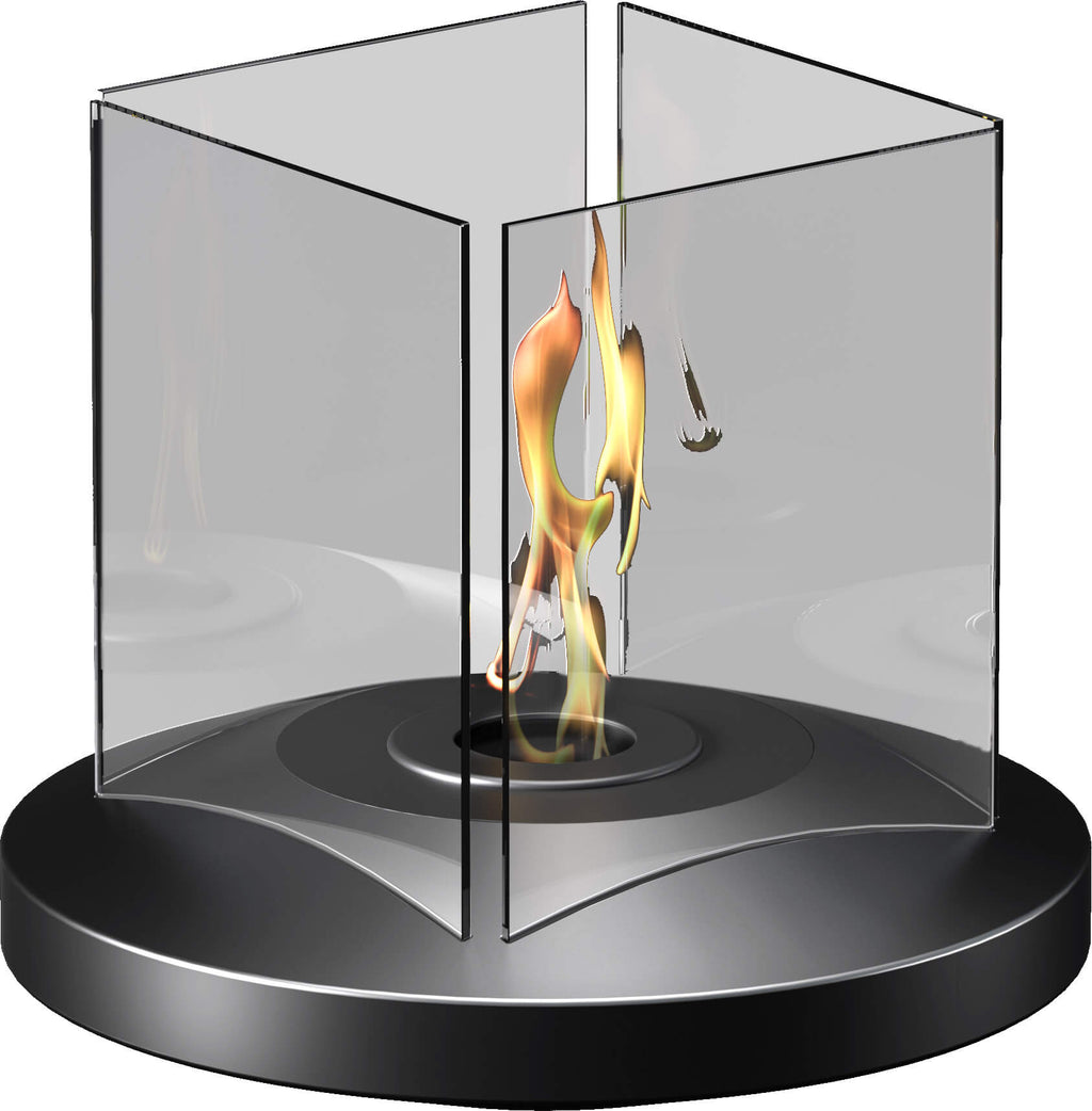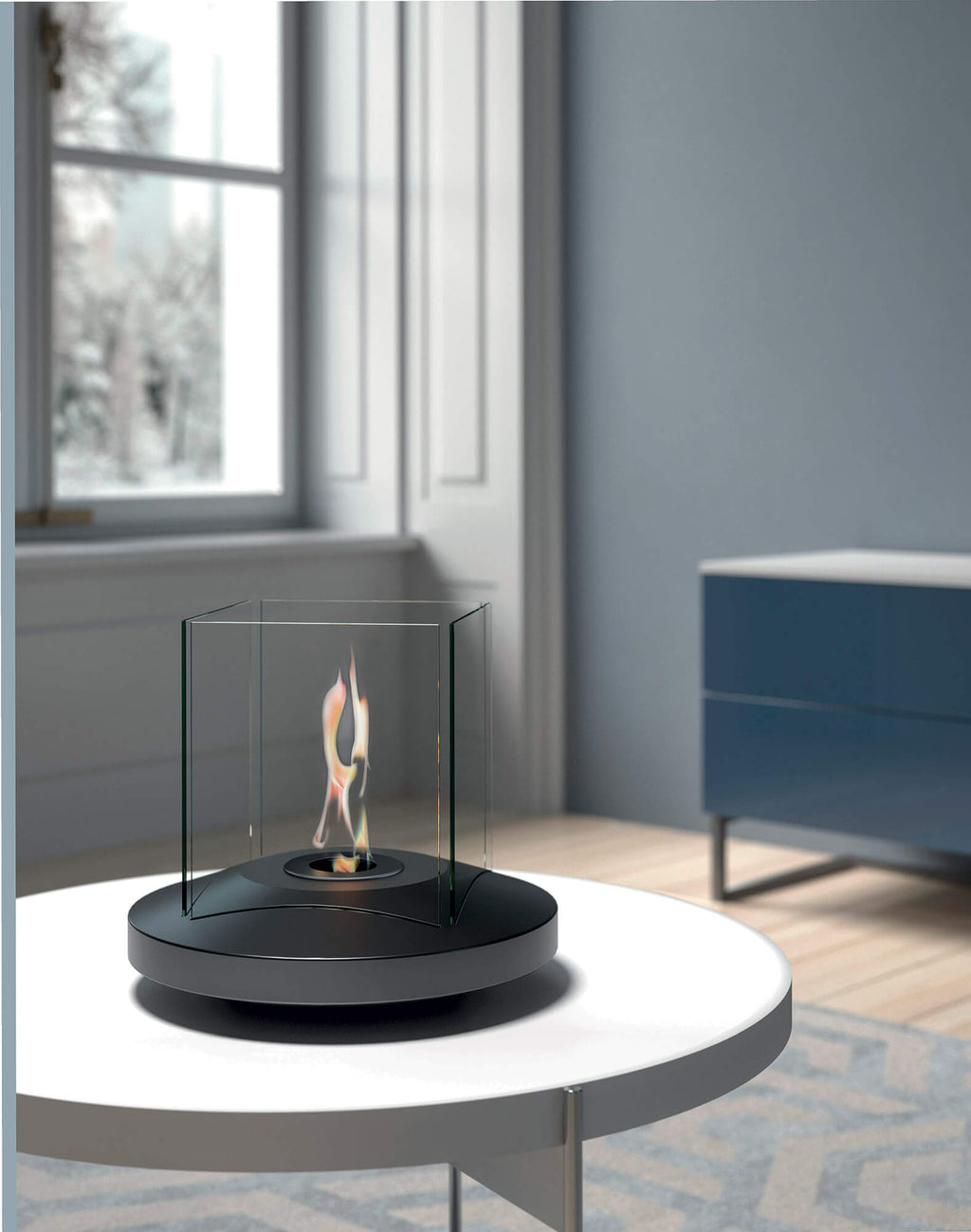 Bio-Tischkamin "Lione" mit raffiniertem und elegantem italienischem Design. Die schwarz lackierte Stahlkonstruktion wird von 4 Schutzgläsern überragt, die gleichzeitig als Dekoration dienen. Ein funktionelles Produkt, das keinen Stromanschluss oder Schornstein benötigt, um die häusliche Umgebung zu heizen und Ruhe zu verbreiten. Der praktische Brenner ist abnehmbar und aus Keramikfaser.