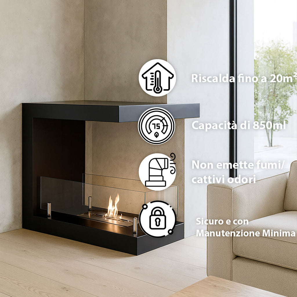 La sua struttura a taglio aperto e i vetri protettivi creano un effetto scenografico che valorizza ogni ambiente, offrendo il piacere di una fiamma vera senza canna fumaria, senza elettricità e senza manutenzione.